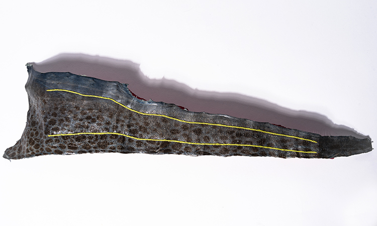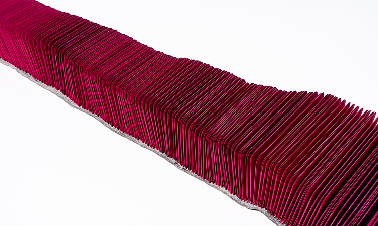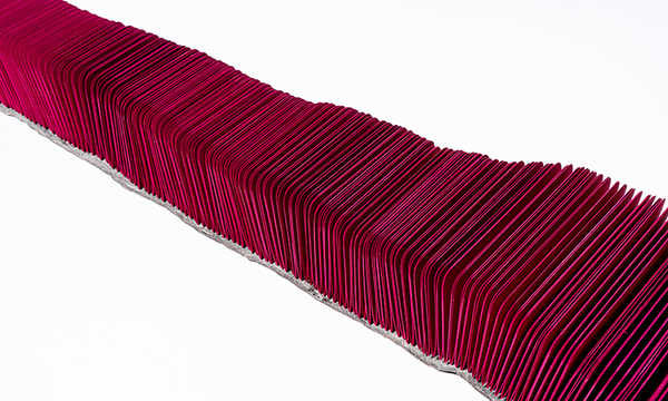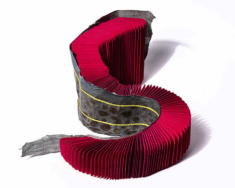 The Icelandic fish book is about material and process. At the start of the quarantine, I turned inward, examining items I had collected over the year is my studio. This fish leather, which I had purchased in 2016 in Reykjavîk, had been pinned to my wall since I returned. Some bright pink cardstock seemed a perfect match, and the two-needle coptic binding a suitable stitch to mimic the organic shape of the leather. The meditative folding and sewing was soothing as the reality of the year started to set in