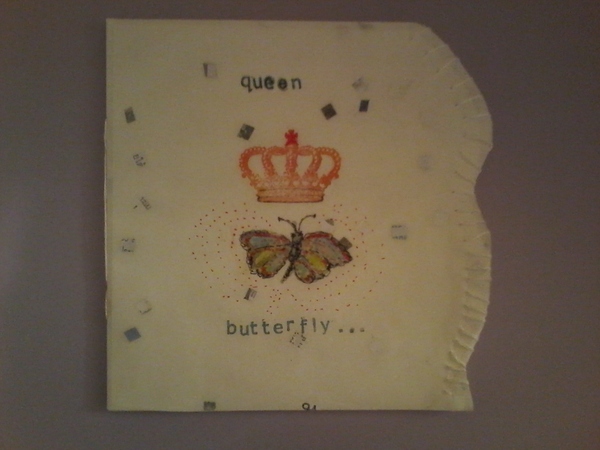 Queen Butterfly Art Book is a small mixed media piece. It is an extension of a previous idea, although this time using different paper, short storytelling for the image, butterfly, and its travels. I'm hoping to create two new pieces - Queen Bird and Queen Bee and their travels using similar paper, thread, and stamping.